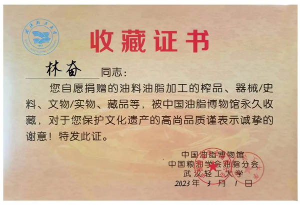 行油脂人之嘉行 展油脂文化傳承后人 | 中國(guó)油脂博物館為中國(guó)資國(guó)業(yè)頒發(fā)收藏證書(shū)
