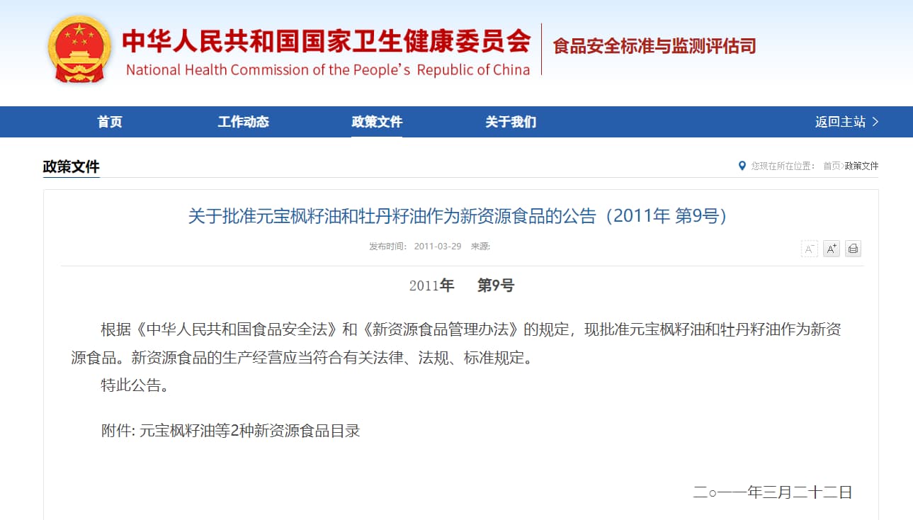 牡丹籽為牡丹開花后結出的種子,油脂含量較高,出油率可達27%-33%[2],可經(jīng)相關工藝制作成籽油。而牡丹籽油且無毒理性,無副作用[3],含40%左右的α-亞麻酸、92%的不飽和脂肪酸、植物甾醇、角鯊烯、維生素E[4]等有效物質,于2011年被國家批準為新資源食品。